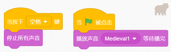 小猫和熊的程序如下图所示,点击绿旗,小猫和熊两个角色同时在播放音乐,按下空格键,下面选项正确的是?