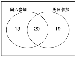 "]根据“周六参加的比周日参加的人数少6人”,可知仅周六参加的比仅周日参加的人数少6人,即仅周日参加的人数为13+6=19人,如下图所示: