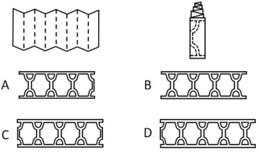 观察图形,将左侧长方形纸沿虚线折叠后,形成8个形状大小完全相等的长方形,两两一组,共分为4组,后按照右图虚线花纹进行裁剪,得到4个镂空完整的花纹图案,只有B项符合。
