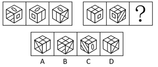 "]两组图形优先观察第一组,均为同一个六面体,图1整体沿水平方向顺时针旋转90°得到图2,图2整体沿水平方向顺时针旋转90°得到图3。第二组图形应用此规律,验证图1到图2,满足此规律,因此“?”处图形应由图2整体沿水平方向顺时针旋转90°得到,即顶面为田字面,左面为斜线面。