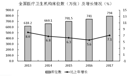 "]A项:定位图形材料,2013-2017年全国医疗卫生机构床位数增加幅度分别为