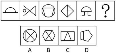 "]元素组成不同,优先考虑属性规律。观察发现,题干图形出现明显等腰元素,优先考虑对称性。题干图形均只有一条对称轴,且对称轴方向依次为竖向、横向、竖向、横向、竖向,故“?”处图形应只有一条对称轴,且为横向,排除B、C两项;继续观察发现,题干图形线条交叉明显,考虑交点数,题干图形的交点数依次为2、3、4、5、6,故“?”处图形的交点数应为7,只有D项符合。