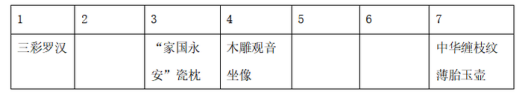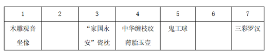 将出场顺序按照1-7进行排序,从确定信息入手。已知②三彩罗汉第一 、③“家国永安”瓷枕第三,根据①木雕观音坐像XX中华缠枝纹薄胎玉壶,可知木雕观音坐像只能在第二、中华缠枝纹薄胎玉壶第五或木雕观音坐像在第四、中华缠枝纹薄胎玉壶第七两种情况。