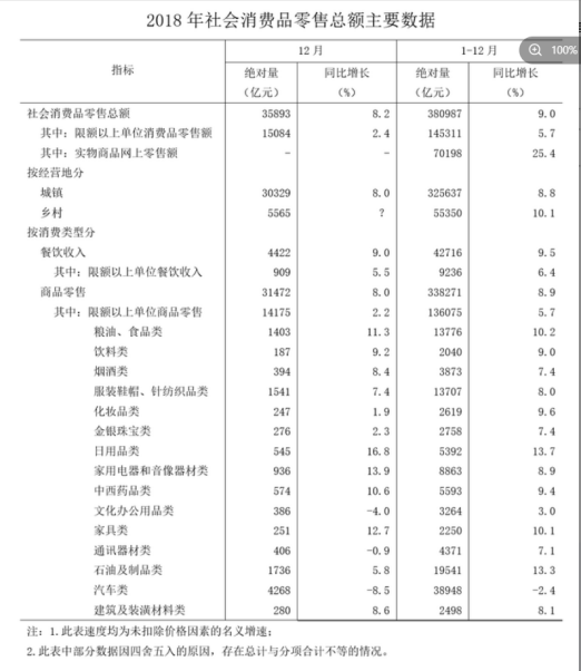 ;2018年12月社会消费品零售总额为35893亿元,同比增长