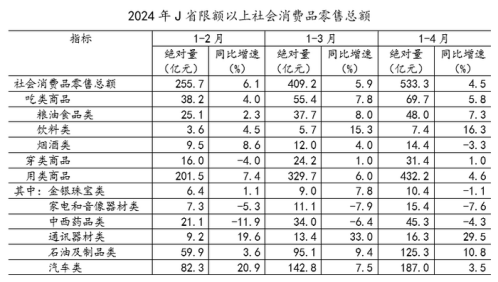 "]根据题干“2023年3月······商品零售总额······”,结合材料时间,可判定本题为基期和差问题。定位表格可知:2024年1—2月、1—3月,J省限额以上穿类商品零售总额分别为16.0、24.2亿元,同比增速分别为