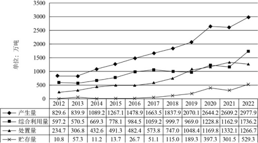 2012—2022年,部分重点城市的一般工业固体废物产生量、综合利用量、处置量及贮存量详见下图。