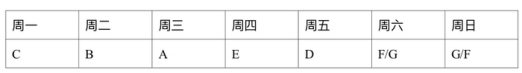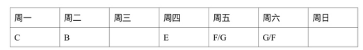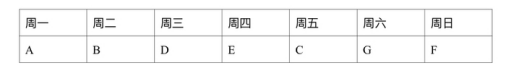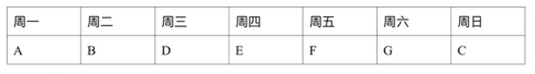情况二:F和G安排在周六和周日,此时结合条件③可知A安排在周三,D安排在周五,列表如下: