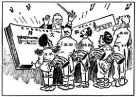 如图是1919年8月发表的漫画《后视镜》。图中美国总统威尔逊指挥合唱“持久和平”,而日本觊觎亚太,英国关注海权,法国重提美法同盟,意大利力图扩张。此画意在( )