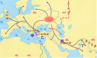 "]据材料印欧人迁徙的路线图,并结合所学可知印欧人最早驯化了马,并使用马拉战车提升了其战斗力,因此能够进行大规模迁徙,迁徙至“乙”处的种群自然也广泛地使用了马以及马拉战车,故①正确;根据所学知识,古巴比伦王国的《汉谟拉比法典》是世界上现存最早的成文法典,其位于两河流域地区,而不是图中的“乙”处,故②错误;据材料“乙”处即小亚细亚,结合所学知识可知该时期此处主要是赫梯人,建立了赫梯王国,赫梯是西亚地区最早发明冶铁技术和使用铁器的国家,故③正确;结合所学知识可知公元前6世纪,波斯人建立了历史上第一个地跨亚、欧、非三大洲的大帝国,首次将西亚与北非文明统一起来,而波斯兴起于伊朗高原,并不是材料中的“乙”处地区,故④错误;选择A项。