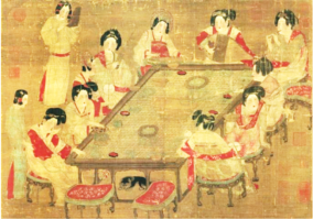 | 《宫乐图》是唐代最具代表性的仕女画之一。画中仕女服饰色彩艳丽、花纹精细,持筚篥(西域龟兹人的乐器)、古筝、笙与牙板等乐器演奏。桌案中摆放一茶釜,案边摆放各式器具,如青瓷碗形杯、红漆黑耳羽觞(酒器)、海棠花型盘等,案旁空置两张月牙几凳(形制受胡床影响) |