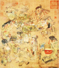 | 《大傩图》是一幅宋代的风俗人物画。画中描绘了街市艺人扮做金刚力士、钟馗等佛、道鬼神,进行傩戏表演。傩是古代一种驱鬼逐疫的祭祀仪式,宋代又加入了戏剧、舞蹈、音乐等多种艺术表现形式,逐渐发展为一种民间娱乐活动 |