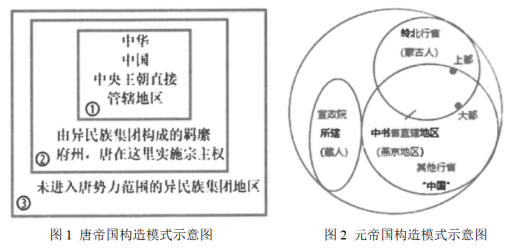 唐、元两个王朝都是中国统一多民族封建国家的重要发展期。图1是唐代的多重型帝国构造模式示意图,图2是元代的多元型帝国构造模式示意图。