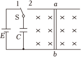 如图所示,匀强磁场中水平放置两足够长的光滑平行金属导轨,导轨的左侧连接电池$E$和电容器$C$,单刀双掷开关$\rm S$接$1$,金属棒$ab$在导轨上处于静止状态。在${{t}_{0}}$时刻$\rm S$接$2$,金属棒$ab$在导轨上向右运动过程中棒始终与导轨垂直且两端与导轨保持良好接触,不计导轨电阻。则金属棒两端电压${{U}_{ab}}$、速度$v$、电容器所带电荷量$q$、回路中电流强度$i$随时间$t$变化的关系图像可能正确的是$(\qquad)$