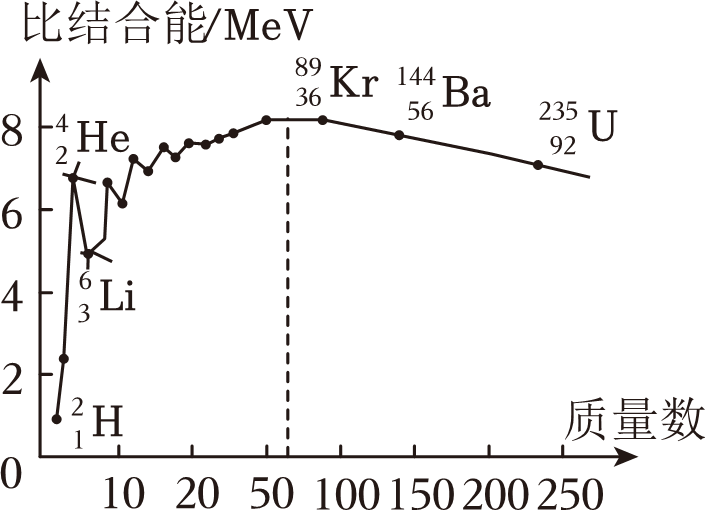 "]$\rm AB$、比结合能是指把原子核内核子分开平均每个核子需要的能量,由图像可知$ _{3}^{6}\;\rm Li$的比结合能约是$5\;\rm MeV$,核子数为$6$,所以结合能为约为$30\;\rm MeV$,故$\rm A$正确,$\rm B$错误;