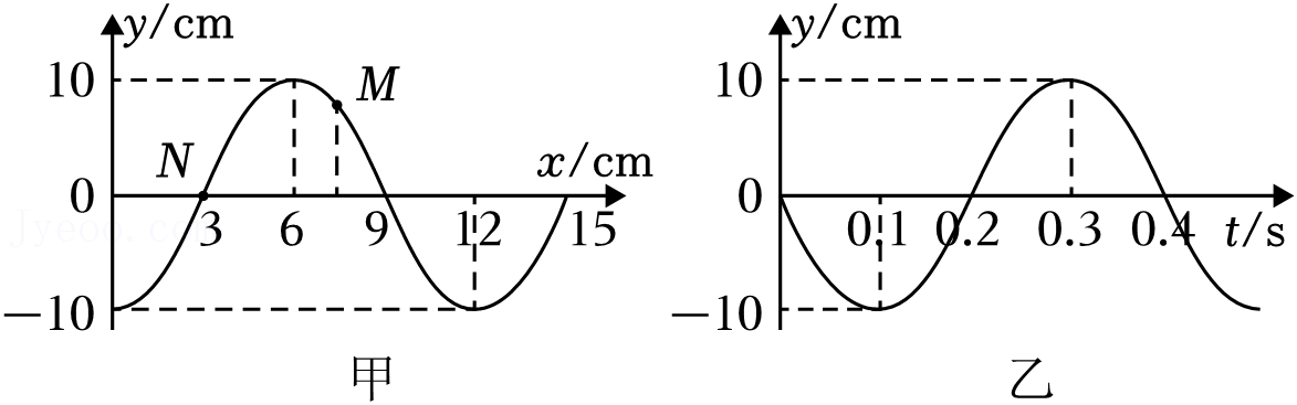 "]]由乙图知,$t=0.2\;\rm s$时质点$N$向上振动,$T=0.4\;\rm s$,自$t=0.2\;\rm s$时刻起,质点$N$的振动方程为$y = A\sin\omega t = 10\sin\dfrac{2\pi}{T} \cdot t = 10\sin 5\pi t(\;\rm cm)$