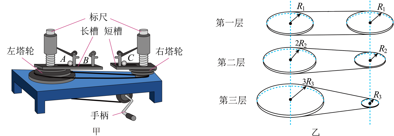 方案一:用如图甲所示的装置,已知小球在挡板$A$、$B$、$C$处做圆周运动的轨迹半径之比为$1:2:1$,变速塔轮自上而下按如图乙所示三种组合方式,左右每层半径之比由上至下分别为$1:1$、$2:1$和$3:1$。回答以下问题:
