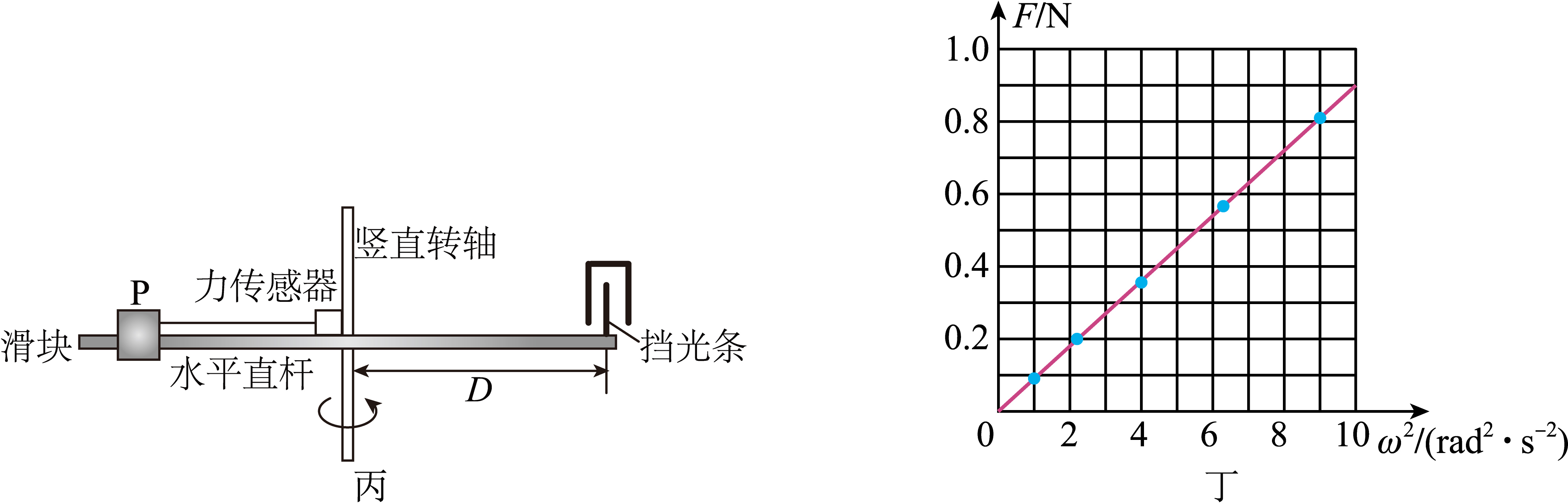 方案二:如图丙所示装置,装置中竖直转轴固定在电动机的转轴上(未画出),光滑的水平直杆固定在竖直转轴上,能随竖直转轴一起转动。水平直杆的左端套上滑块$P$,用细线将滑块$P$与固定在竖直转轴上的力传感器连接,细线处于水平伸直状态,当滑块随水平直杆一起匀速转动时,细线拉力的大小可以通过力传感器测得。水平直杆的右端最边缘安装了宽度为$d$的挡光条,挡光条到竖直转轴的距离为$D$,光电门可以测出挡光条经过光电门所用的时间(挡光时间)。滑块$P$与竖直转轴间的距离可调。回答以下问题: