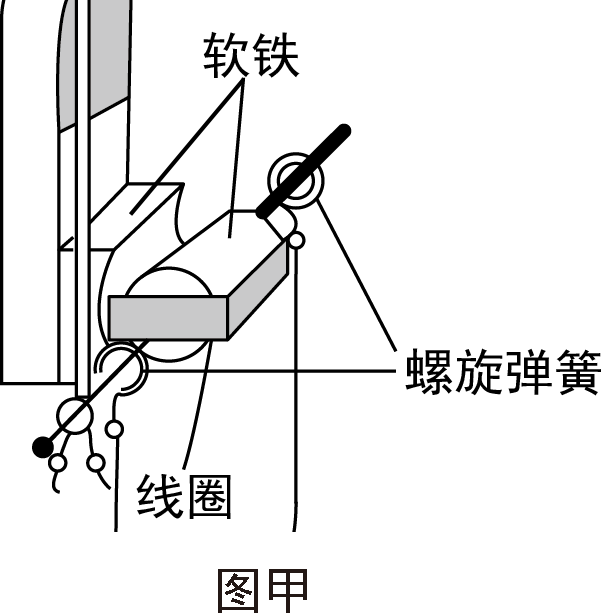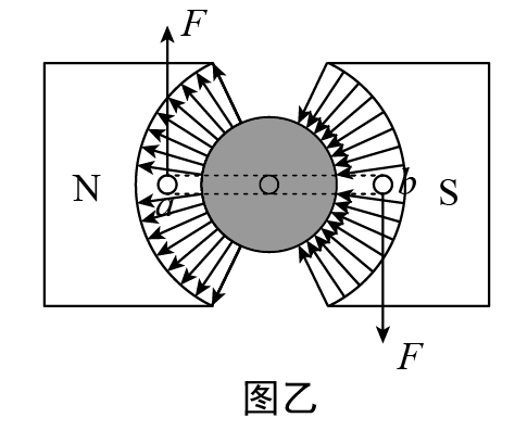 如图甲所示是磁电式电流表的结构,蹄形磁铁和铁芯间的磁场均匀辐向分布,线圈匝数为$n$,面积为$S$,线圈$a$、$b$两边导线长均为$l$,所在处的磁感应强度大小均为$B$,当线圈中通电流$I$时,$a$、$b$边所受安培力$F$方向加图乙所示。则$(\qquad)$