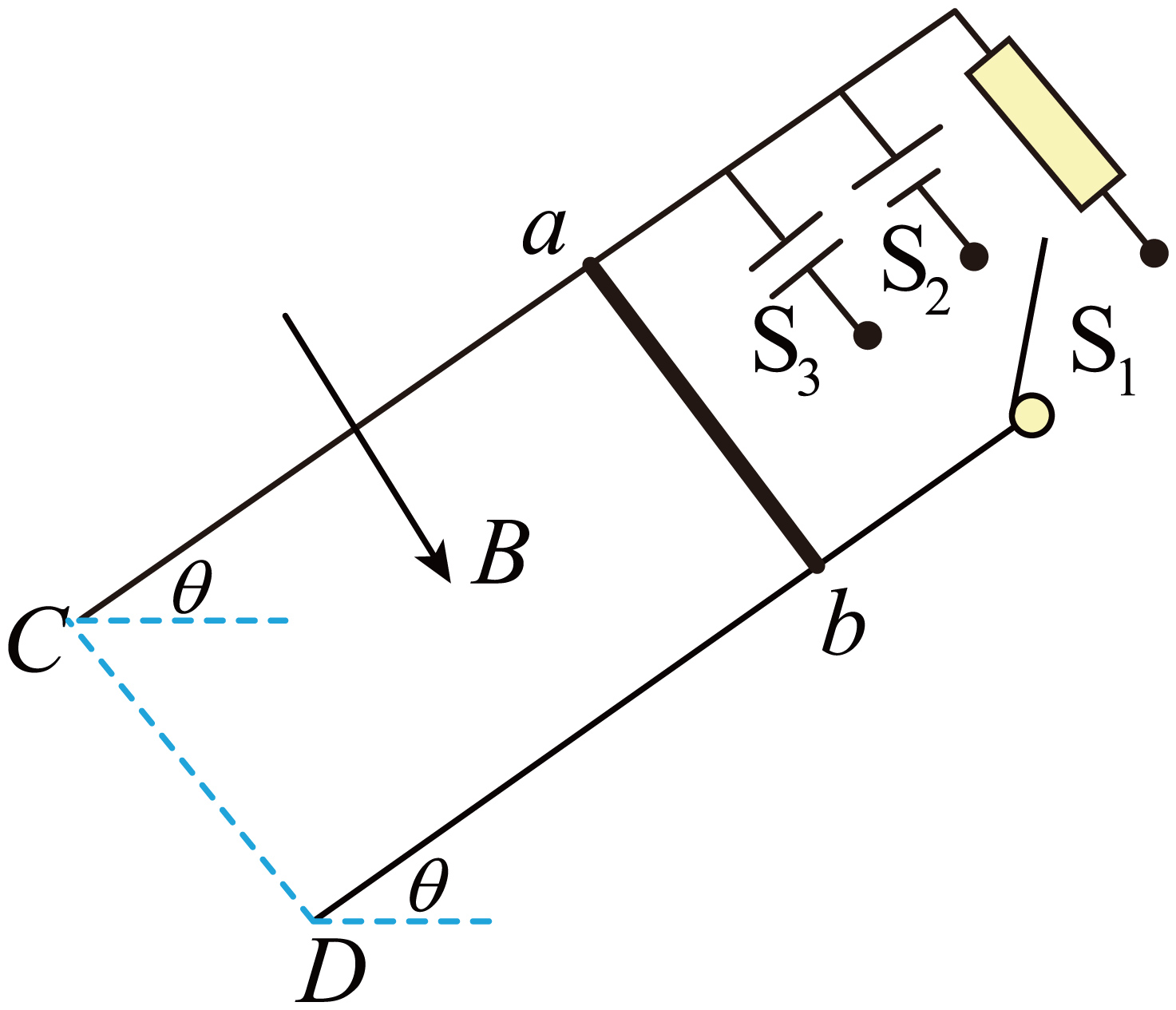 ","当开关打到$S_{3}$同时解除对金属杆$ab$的锁定,则在$t$ $s$内金属杆运动的位移为$\\dfrac{mgt^{2}\\sin\\theta}{2\\left( B^{2}L^{2}C+m \\right)}$