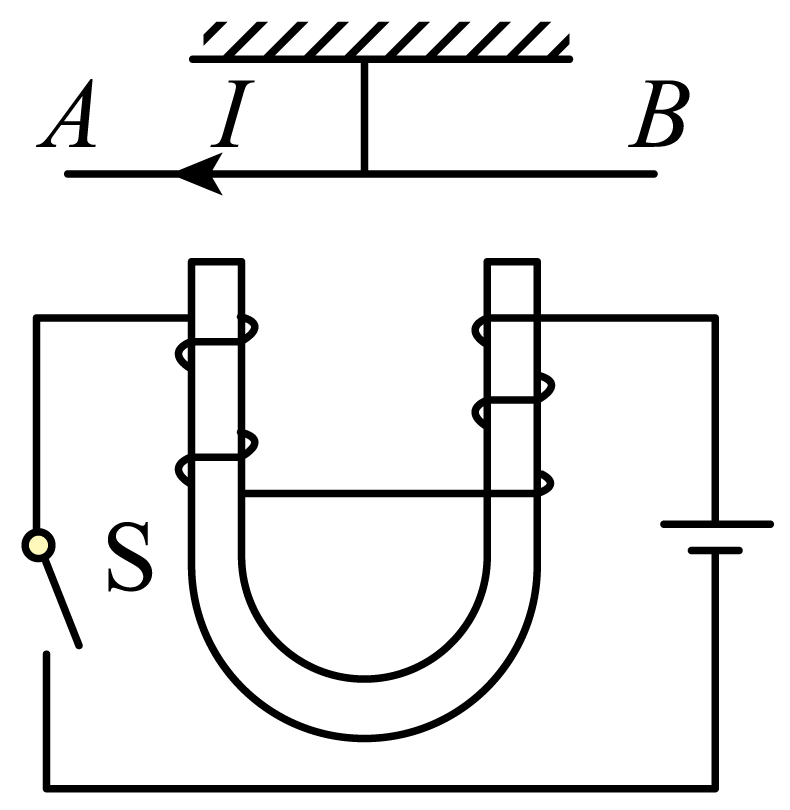 如图所示,将通电直导线$AB$用悬线悬挂在电磁铁的正上方,直导线可自由转动,则接通开关$(\qquad)$