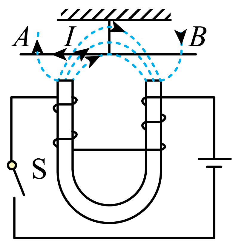 "]当开关$\rm S$接通时,根据安培定则知电磁铁附近磁感线的分布如下图所示