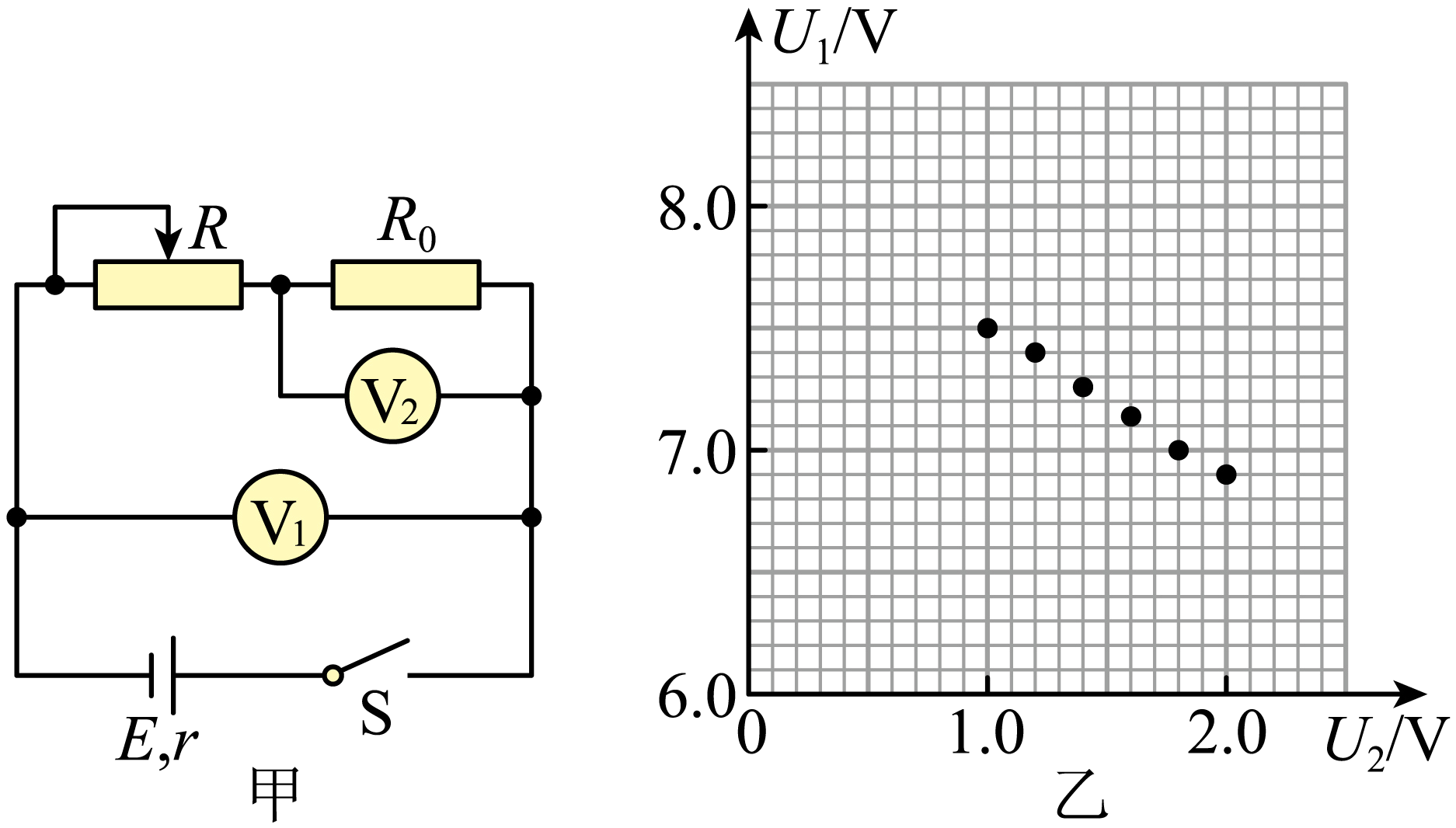 由闭合电路的欧姆定律,得$E=U_{1}+\left( \dfrac{U_{1}}{R_{{V1}}}+2\dfrac{U_{2}}{R_{0}} \right)r$