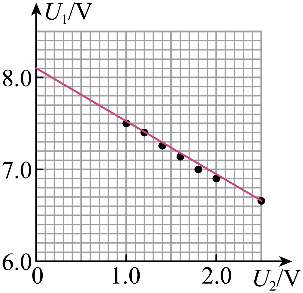 实验小组完成连线后,如果图线与纵轴的交点坐标为$(0,8.1\;\rm V)$,图线的斜率的绝对值为$0.6$,则通过计算可得电源的电动势为$E=$ $\;\rm V$,电源内阻$r=$ $\;\rm \Omega$。(结果均保留一位小数)