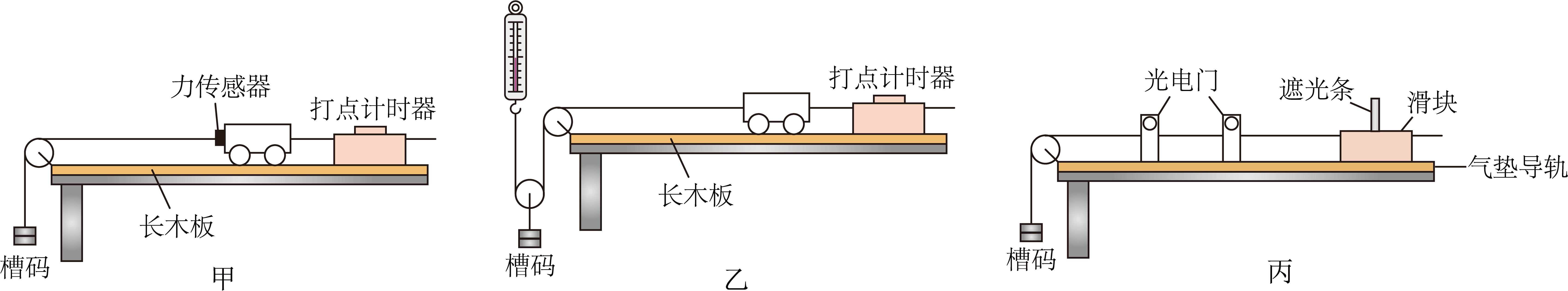 为探究物体加速度$a$与外力$F$和物体质量$M$的关系,研究小组的同学们在教材提供案例的基础上又设计了不同的方案,如图甲、乙、丙所示:甲方案中在小车前端固定了力传感器,并与细线相连,可以从传感器上直接读出细线拉力;乙方案中拉动小车的细线通过滑轮与弹簧测力计相连,从弹簧测力计上可读出细线拉力;丙方案中用带有光电门的气垫导轨和滑块代替长木板和小车。三种方案均以质量为$m$的槽码的重力作为动力。