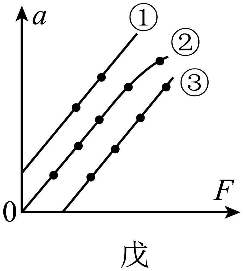 甲方案实验中,以小车的加速度$a$为纵坐标、钩码的重力$F$为横坐标作出的$a-F$图像戊理想状态下应是一条过原点的直线,但由于实验误差影响,常出现如图所示的三种情况。关于这三种情况下列说法中正确的是$(\quad\ \ \ \ )$