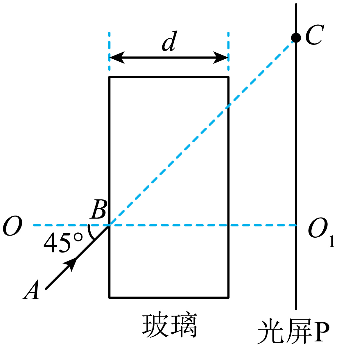 光屏$P$竖直放置,直线$OO_{1}$与光屏垂直,用激光笔沿与$OO_{1}$方向成$45^\circ$角的$AB$方向照射光屏,光屏上$C$处有激光亮点。此时在光屏前竖直放置厚度为$d$的平板玻璃,激光亮点从光屏上的$C$点移动到$D$点(未画出),$CD$间距为$\dfrac{d}{2}$。已知光在真空中传播的速度为$c$。求: