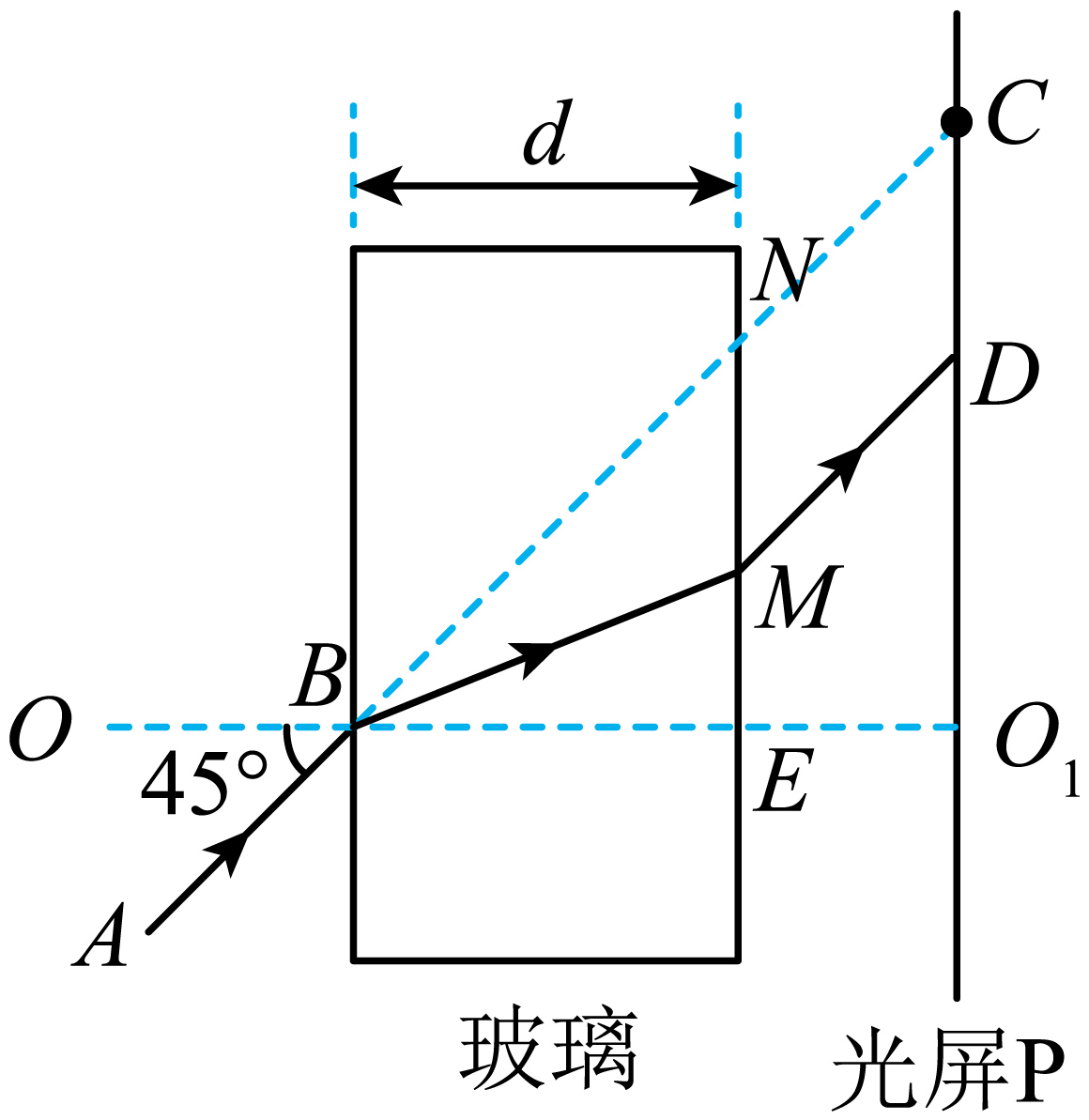 "]]光通过玻璃砖折射后出射光线与入射光线平行,过$D$点作$DM // CN$,完成光路图如图所示