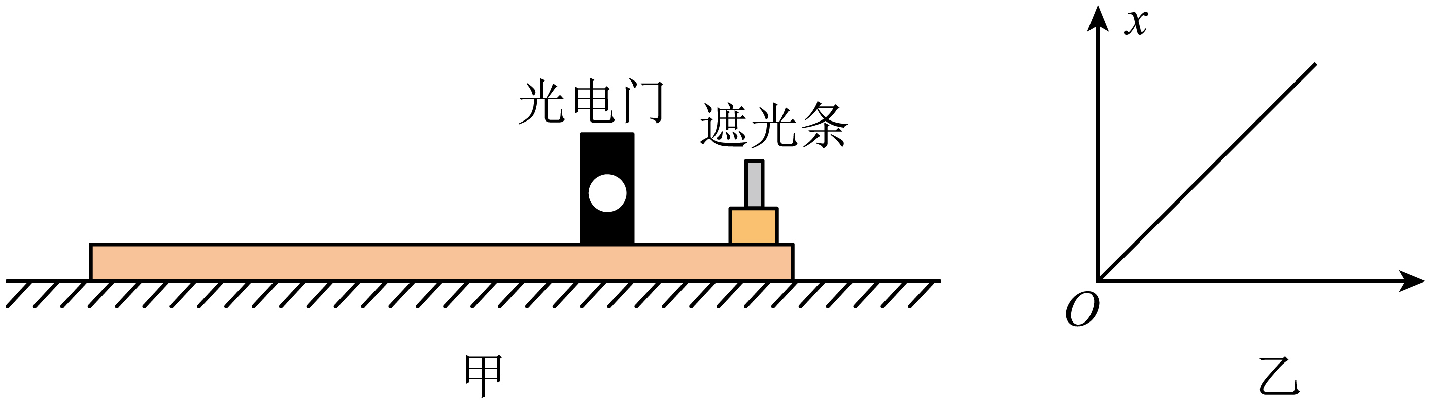 实验时获得多组数据后,得出的图像如图乙所示,该图像的纵坐标为$x$,则横坐标为 (填“ $\dfrac{1}{t}$”“ $t^{2}$”或“ $\dfrac{1}{t^{2}}$”)。若直线的斜率为$k$,则滑块与木板之间的动摩擦因数$\mu =$ (用题中物理量的符号$d$,$k$和$g$表示)。