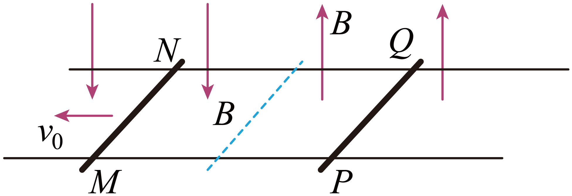 如图所示,水平面内固定有两根平行的光滑长直金属导轨,导轨间距为$l$,电阻不计。整个装置处于两个磁感应强度大小均为$B$、方向相反的竖直方向匀强磁场中,虚线为两磁场的分界线,质量为$m$、导轨间电阻为$R$的导体棒$MN$和质量为$2m$、导轨间电阻为$2R$的导体棒$PQ$静置于图示的导轨上(两棒始终与导轨垂直且接触良好)。现使$MN$棒获得一个大小为$v_{0}$、方向水平向左的初速度,则在此后的整个运动过程中$(\qquad)$
