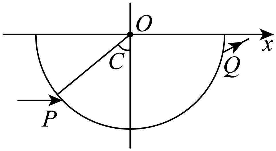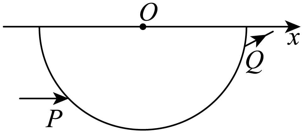 如图,玻璃砖的横截面是半径为$R$的半圆,圆心为$O$点,直径与$x$轴重合。一束平行于$x$轴的激光,从横截面上的$P$点由空气射入玻璃砖,从$Q$点射出。已知$P$点到$x$轴的距离为$\dfrac{\sqrt{2}}{2}R$,$P$、$Q$间的距离为$\sqrt{3}R$。