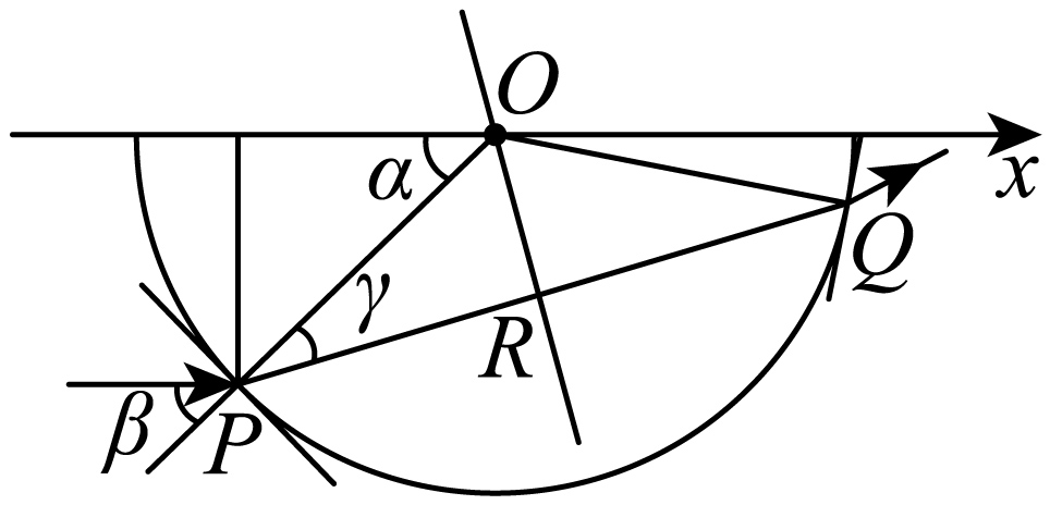 在该横截面沿圆弧任意改变入射点的位置和入射方向,使激光能在圆心$O$点发生全反射,求入射光线与$x$轴之间夹角的范围。