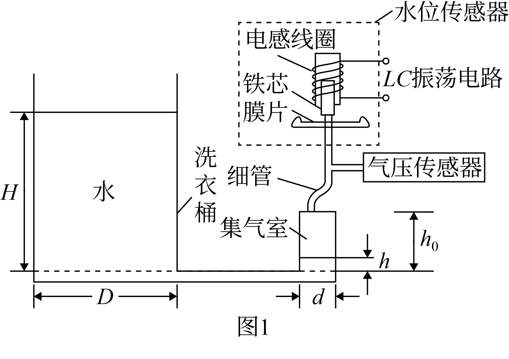 自动洗衣机水位检测的精度会影响洗净比和能效等级。某款洗衣机水位检测结构如图$1$所示。洗衣桶内水位升高时,集气室内气体压强增大,铁芯进入电感线圈的长度增加,从而改变线圈的自感系数。洗衣机智能电路通过测定$LC$振荡电路的频率来确定水位高度。