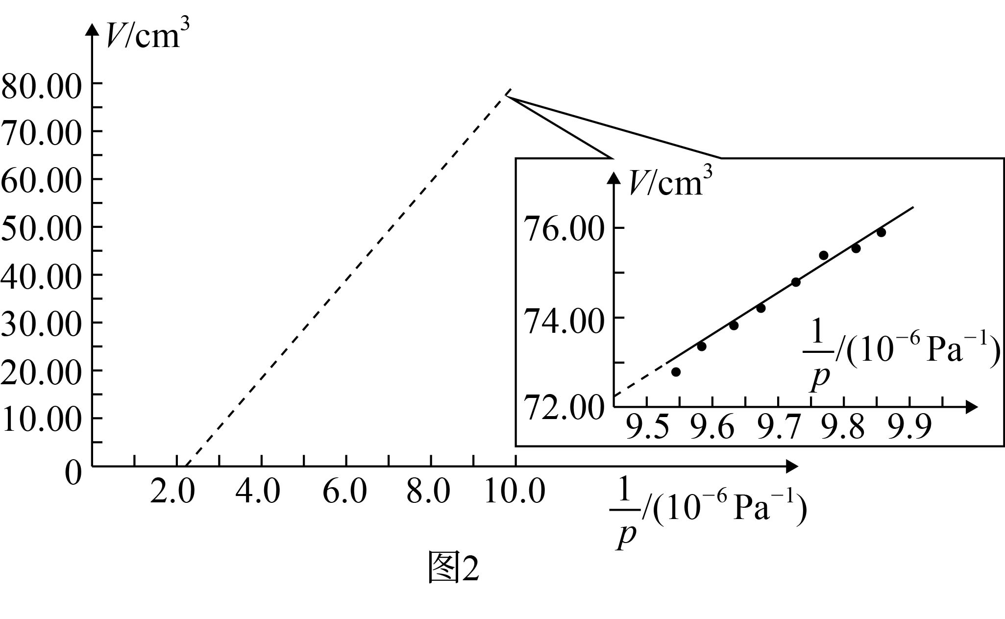 ③该延长线不过原点的主要原因是与集气室相连的细管中的气体被忽略不计,导致集气室气体体积$V$相比于实际气体体积偏小;