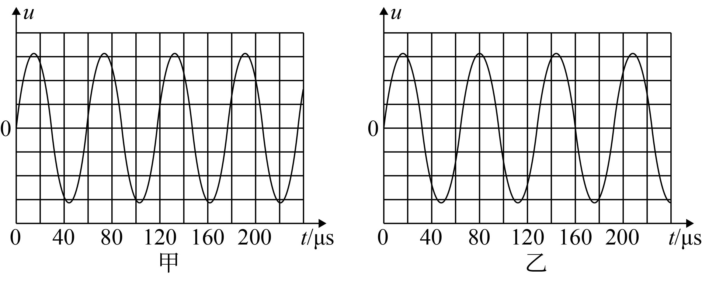 研究洗衣桶水位高度与振荡电路频率的关系图是桶内水位在两个不同高度时示波器显示的$u − t$图像,$u$的频率即为$LC$振荡电路的频率。$LC$振荡电路的频率$f$与线圈自感系数$L$、电容$C$的关系是$f= \dfrac{1}{2\pi\sqrt{LC}}$,则图中 (填“甲”或“乙”)对应的水位较高。
