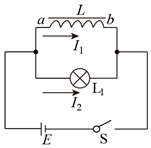 如图,电路为演示自感现象的实验电路,实验时,先闭合开关$\rm S$,稳定后设通过线圈$L$的电流为$I_{1}$,通过小灯泡$E$的电流为$I_{2}$,小灯泡处于正常发光状态,迅速断开开关$\rm S$,则可观察到灯泡$E$闪亮一下后熄灭,在灯$E$闪亮短暂过程中$(\qquad)$