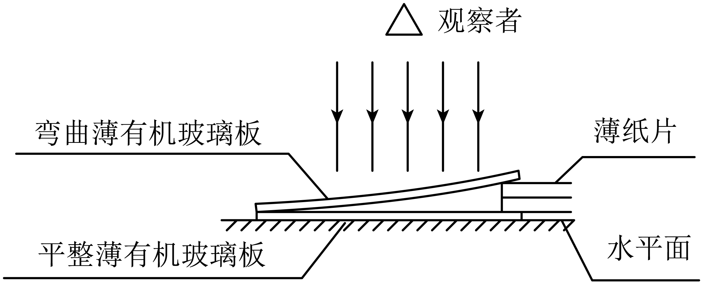 劈尖干涉是一种薄膜干涉。在水平面上将一块厚度均匀的薄有机玻璃板放在另一块厚度均匀的薄有机玻璃板之上,在一端夹入两张薄纸片,上玻璃板由于重力影响微微弯曲,装置侧视图如图所示。用单色平行光竖直向下照射,则观察者观测到的干涉图样最可能的是$(\qquad)$
