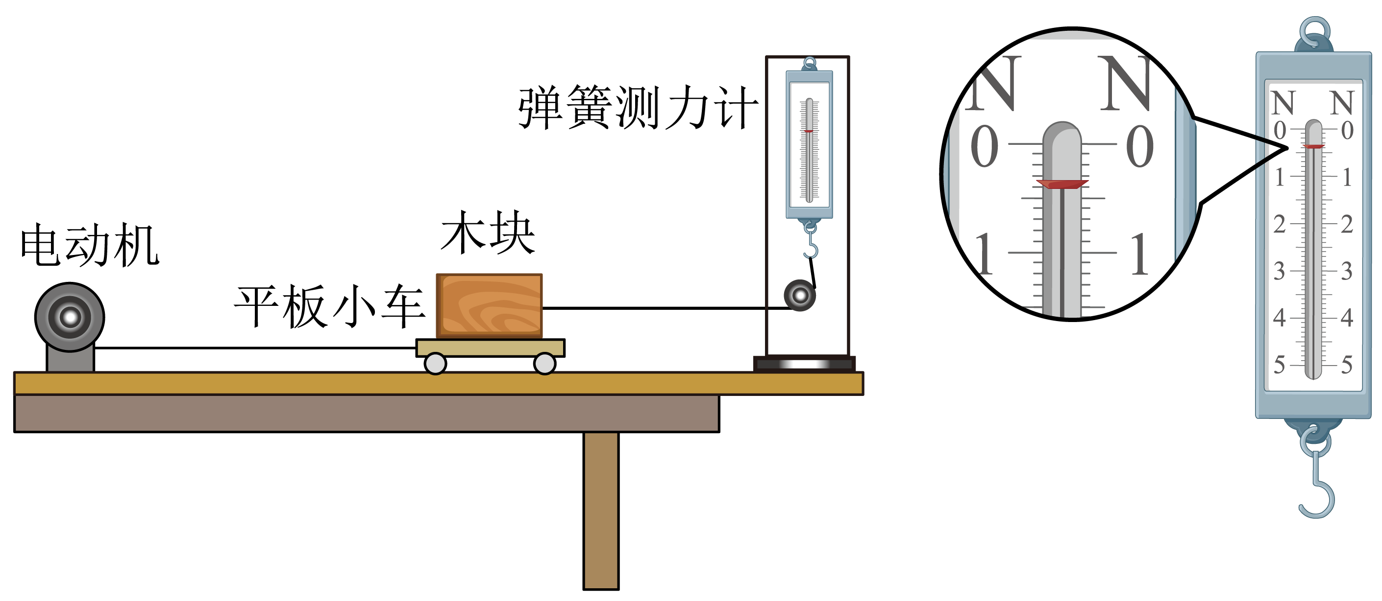 按照如图方式组装实验器材,将木块一端通过轻绳连接弹簧测力计,平板小车一端通过轻绳连接电动机,由电动机带动平板小车运动;