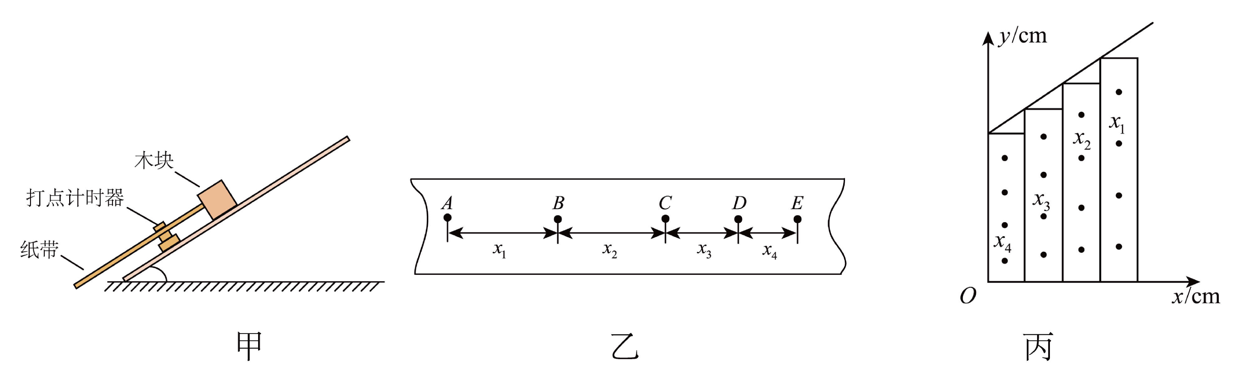 该同学将图乙中的$4$段纸带剪开贴到坐标纸上,如图丙,发现这些纸带的左上顶点在一条倾斜直线上,说明此物体做 直线运动。若图丙中直线斜率为$k$(其中$k=\dfrac{\Delta y}{\Delta x}$,$k$无单位),纸带宽为$d$,则用该方法得到的加速度$a=$ 。(用$k$、$d$表示)
