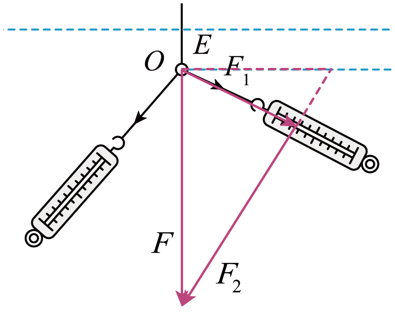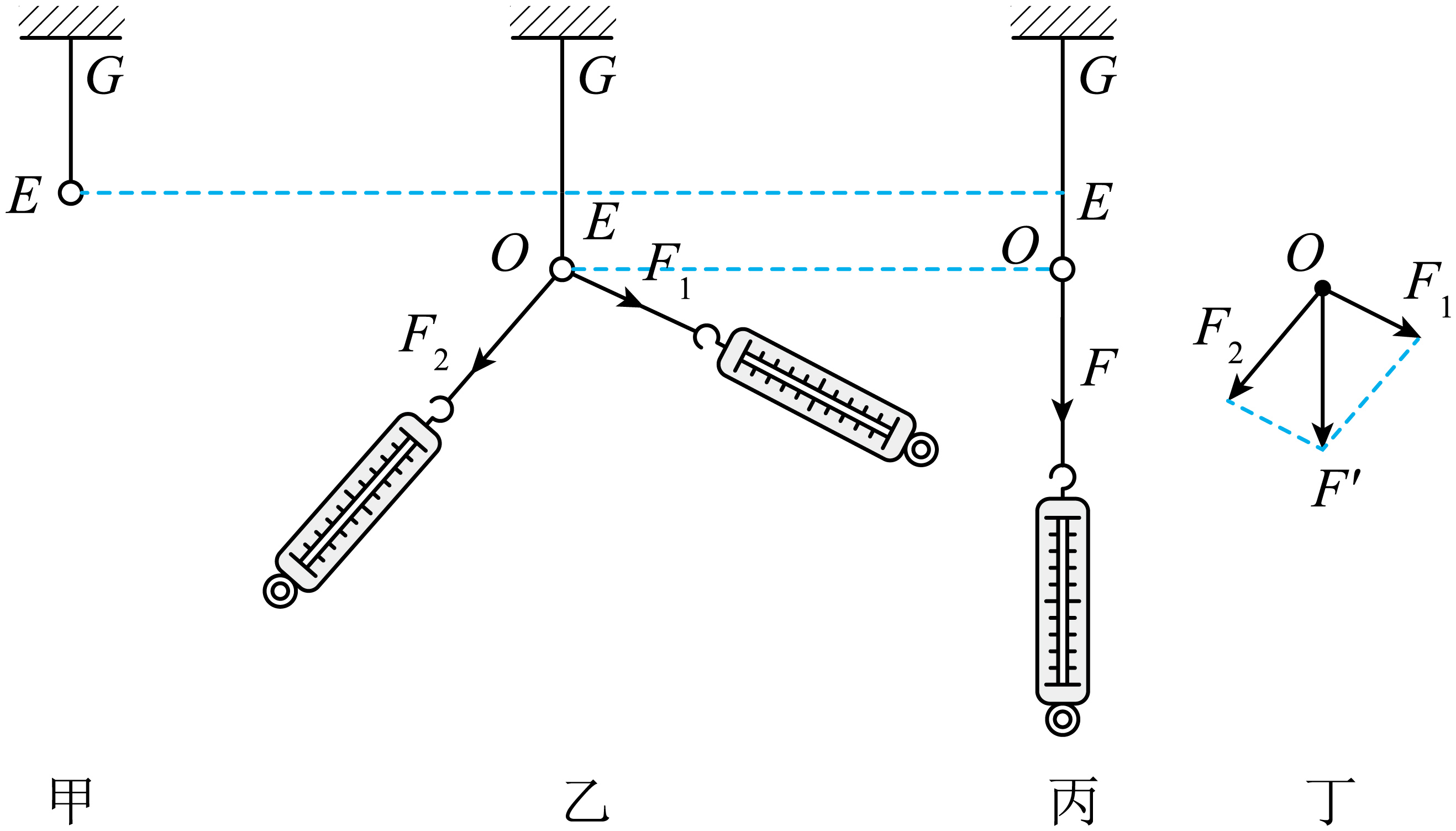 $b$.如图乙所示,用手通过两个弹簧测力计共同拉动橡皮条。橡皮条和细绳套的连接点在拉力$F_{1}$、$F_{2}$的共同作用下,位于$O$点,橡皮条伸长的长度为$EO$。