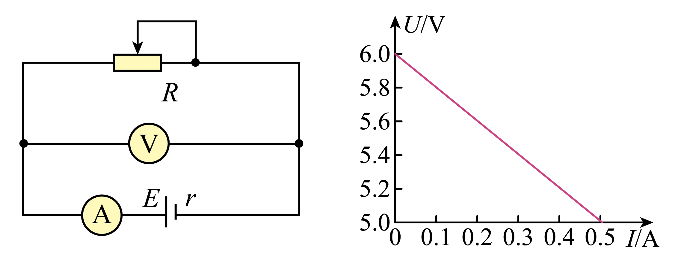 $U − I$图像的纵截距表示电源电动势,斜率的绝对值表示电源内阻,故$E=6.0\;\rm V$,$r=\dfrac{6.0-5.0}{0.5}\;\rm\Omega=2.0\;\rm \Omega$