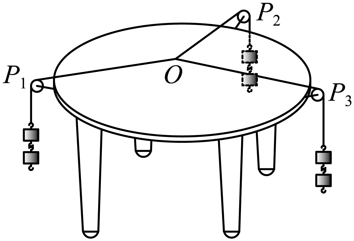 某物理实验小组用如图所示器材探究两个互成角度的力的合成规律。在圆形水平桌面上平铺并固定一张白纸,在桌子边缘安装三个光滑的滑轮,其中滑轮$P_{2}$固定在桌子边,滑轮$P_{1}$、$P_{3}$可沿桌边移动。三根绳子系在同一点$O$,在每根轻绳下分别挂上一定数量的钩码,并使结点$O$(不与桌面接触)静止。(已知$\sin37^\circ =0.6$,$\cos37^\circ =0.8$)