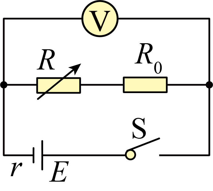 为测量某家用电器内电池的电动势和内阻,小何同学将电阻箱$R$和阻值为$1.0\;\rm \Omega$的定值电阻$R_{0}$串联后接在该电池的两端,如图所示。当电阻箱阻值为$1.0\;\rm \Omega$时电压表读数为$6.4\;\rm V$; 电阻箱阻值为$6.5\;\rm \Omega$时电压表读数为$7.5\;\rm V$。则该电池的电动势为 $\:\rm V$, 内阻为 $\;\rm \Omega$。
