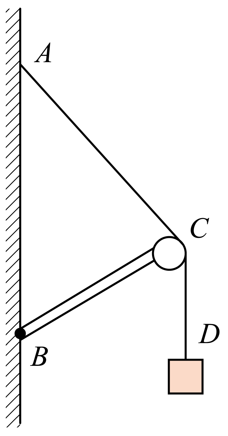 "]$\rm A$.当系统平衡时,绳的拉力始终等于重物的重力,故绳的拉力不变,$∠ACD$夹角变大,由于是动杆活结,所以轻杆平分$∠ACD$,即角$∠BCD$增大,则轻杆与竖直墙壁的夹角变大,故$\rm A$错误;