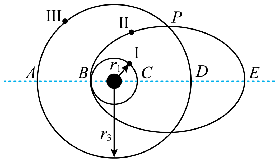 宇宙中有一孤立星系,中心天体的周围有三颗行星,如图所示。中心天体质量远大于行星质量,不考虑行星之间的万有引力,行星$\rm I$、$\rm III$运行的圆轨道半径分别为$r_{1}$、$r_{3}$,行星$\rm II$运行的椭圆轨道半长轴$a=r_{3}$,且与行星$\rm I$轨道在$B$点相切,行星$\rm II$轨道距中心天体最远处为$E$,则行星$\rm II$、$\rm III$的运行周期之比为 ,行星$\rm I$、$\rm II$在$B$点的加速度之比为 ,行星$\rm II$在$B$、$E$两点的速率之比为 。