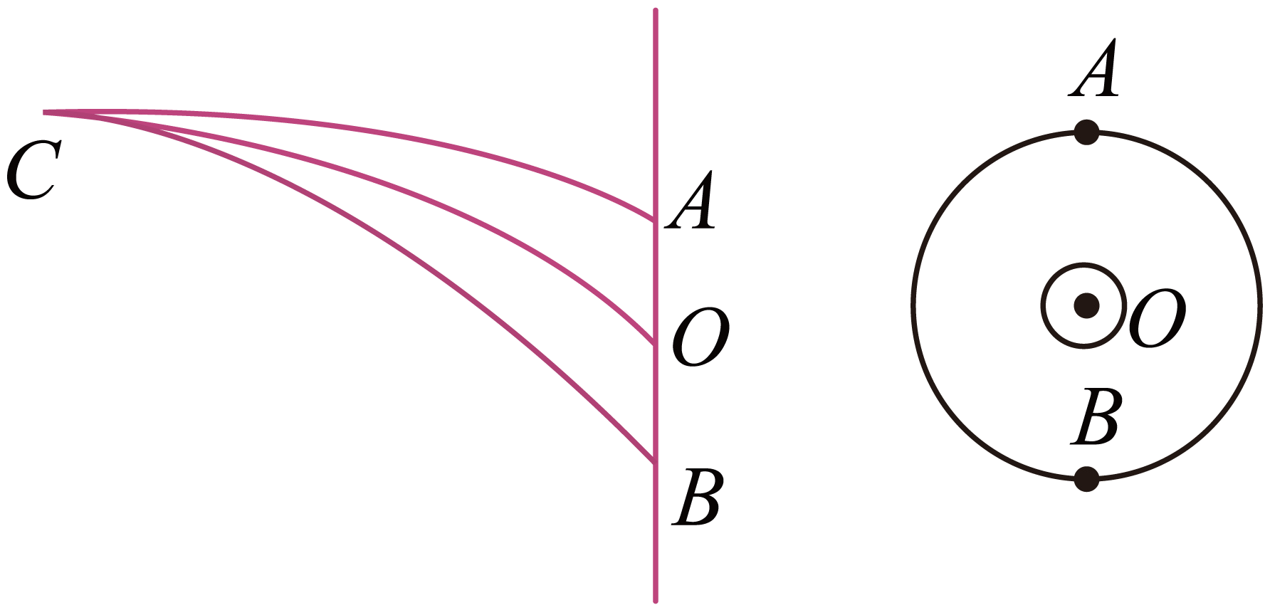某同学站在投镖线上从同一点$C$处水平抛出多个飞镖,结果以初速度$v_{A}$投出的飞镖打在$A$点,以初速度$v_{B}$投出的飞镖打在$B$点,始终没有打在竖直标靶的中心$O$点,如图所示。为了能把飞镖打在标靶的中心$O$点,则他在正式比赛中,可采取的措施是$(\qquad)$