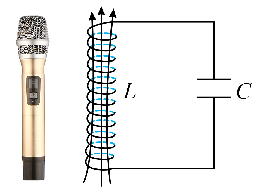 无线话筒是一个将声信号转化为电信号并将信号发射出去的装置,其内部电路中有一部分是$\rm LC$振荡电路,若话筒使用时,某时刻话筒中$\rm LC$振荡电路的磁场方向如图所示,且电流正在减小,则电容器正在 (填“充电”或“放电”),电容器下板带 (填“正电”或“负电”),电场能正在 (填“增加”或“减少”)。